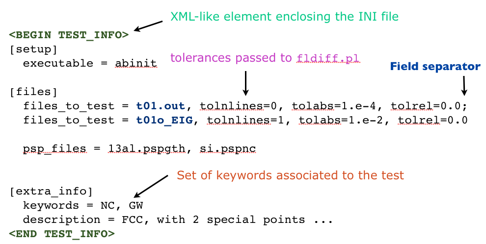 The <TEST_INFO> section is placed at the end of the input file in order to avoid problems with executables reading from standard input. The XML-like markers <BEGIN_TEST_INFO> and <END_TEST_INFO> enclose the section. Each line starts with the sentinel #%% that will be removed during the parsing. What is left is a standard INI configuration file providing all the information needed to run the test and to analyze the final results. The figure below shows how options are grouped in different sections: